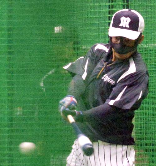試合前練習に顔面ガードを付けて登場の鳥谷敬はフリー打撃を行う(撮影・河南真一)