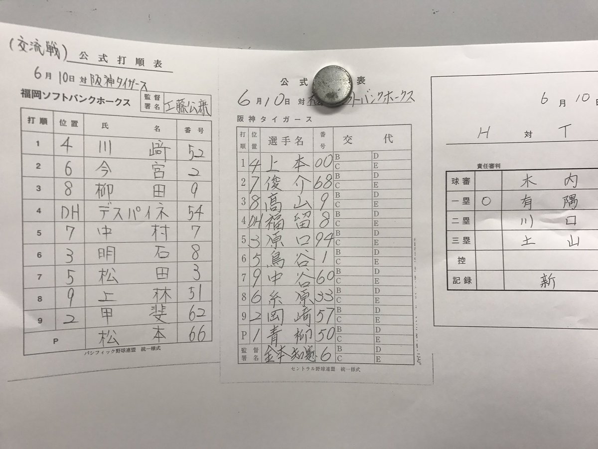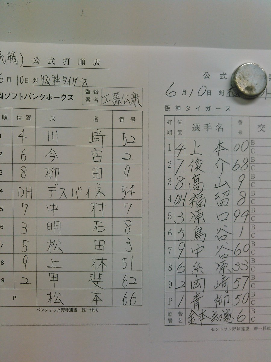 ソフトバンク対阪神戦の先発オーダーです。