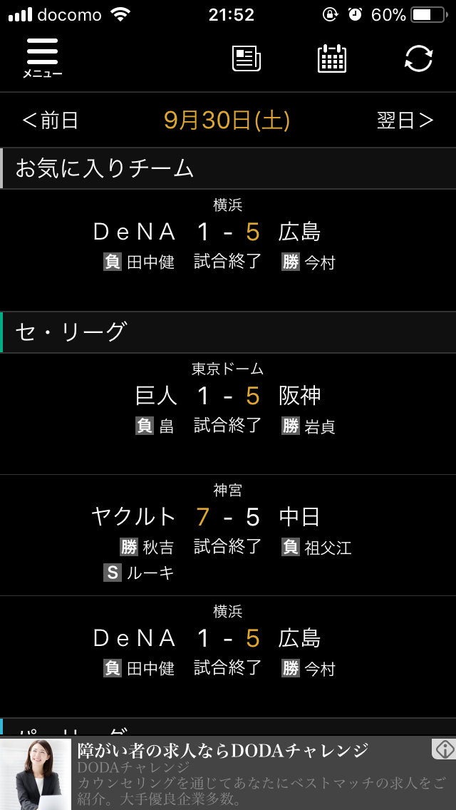 9/29 広------------------------神-------横-巨-----//----------------中----------------------------------ヤ