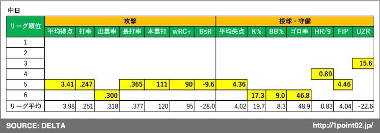 中日 先発2.5 救援3.0 攻撃2.5 走塁4.0 守備4.0 選手層2.5 総合18.5 D
