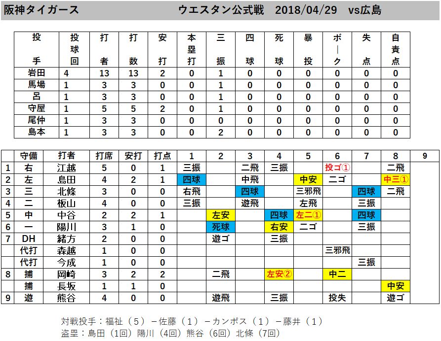 【ファーム試合結果】阪神vs広島 2018/04/29 2018年04月30日 カテゴリ:ファーム試合結果 2018 mixiチェック 【管理人コメント】試合は5-0で阪神が勝利しました。投手では先発の岩田投手が4回無失点の好投。2番手としてドラ1ルーキーの馬場投手が公式戦初登板を果たし、1回無失点とし初勝利となりました。6投手との継投となり無失点とし、完封リレーとなりました。野手では岡崎選手が2安打2打点と活躍しています。中谷選手と島田選手も2安打1打点としています。中谷選手の1安打目は鋭い打球で三遊間を抜けていくヒット、2安打目は左中間真っ二つの鋭い当たりでした。徐々に状態がいい時に戻りつつあるのかもしれませんね。 「試合結果」カテゴリの最新記事 コメント コメント一覧 1. 名無しの虎 2018年04月30日 07:17 ID:Ou818cC10 中谷ええやん! 岡崎さんもまだまだ一軍諦めてないな 2. 名無しの虎 2018年04月30日 08:08 ID:vBg.8yu00 【悲報】江越、江越 3. 名無しの虎 2018年04月30日 08:38 ID:mLF.OISU0 岩田は熊谷君に江越などの固いセンターラインなら生きられるからな 4. 名無しの虎 2018年04月30日 08:48 ID:IwnIatA20 セカンドはともかく今の一軍の守備でも岩田行けるんやないか? セカンド鳥上ショート糸植サード糸大 5. 名無しの虎 2018年04月30日 09:59 ID:VXXiaHAY0 高山の打撃練習を試合で見るよりは今の中谷でもずいぶんマシ。 6. 名無しの虎 2018年04月30日 10:18 ID:.jSb.UaE0 ルー君初めて見たけど、なかなか面白いピッチャーやね 体幹鍛えたらええ投手になりそう 7. 名無しの虎 2018年04月30日 10:20 ID:13lYlg6G0 江越は極端だから仕方ない 8. 名無しの虎 2018年04月30日 17:03 ID:I3qHBKXH0 高山の今の現状って打撃練習にすらなってないから、だったら中谷でも江越でも板山でも上げればいいのに。 あと未来のない西岡はもういらん。 コメントする コメントフォーム 名前 コメント 記事の評価 リセット リセット 顔 星 情報を記憶 コメントを投稿する