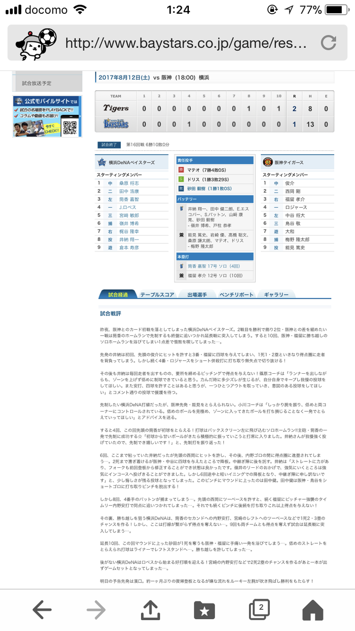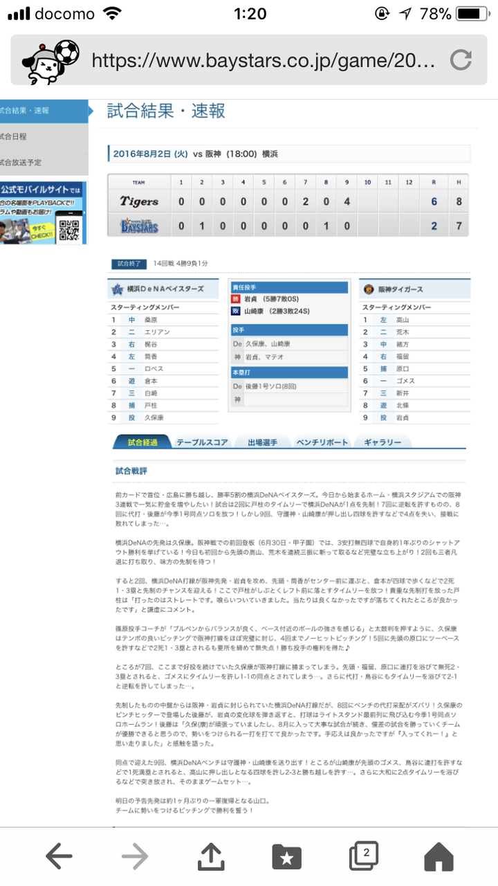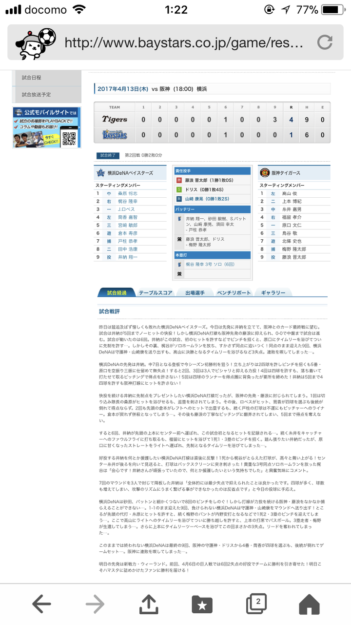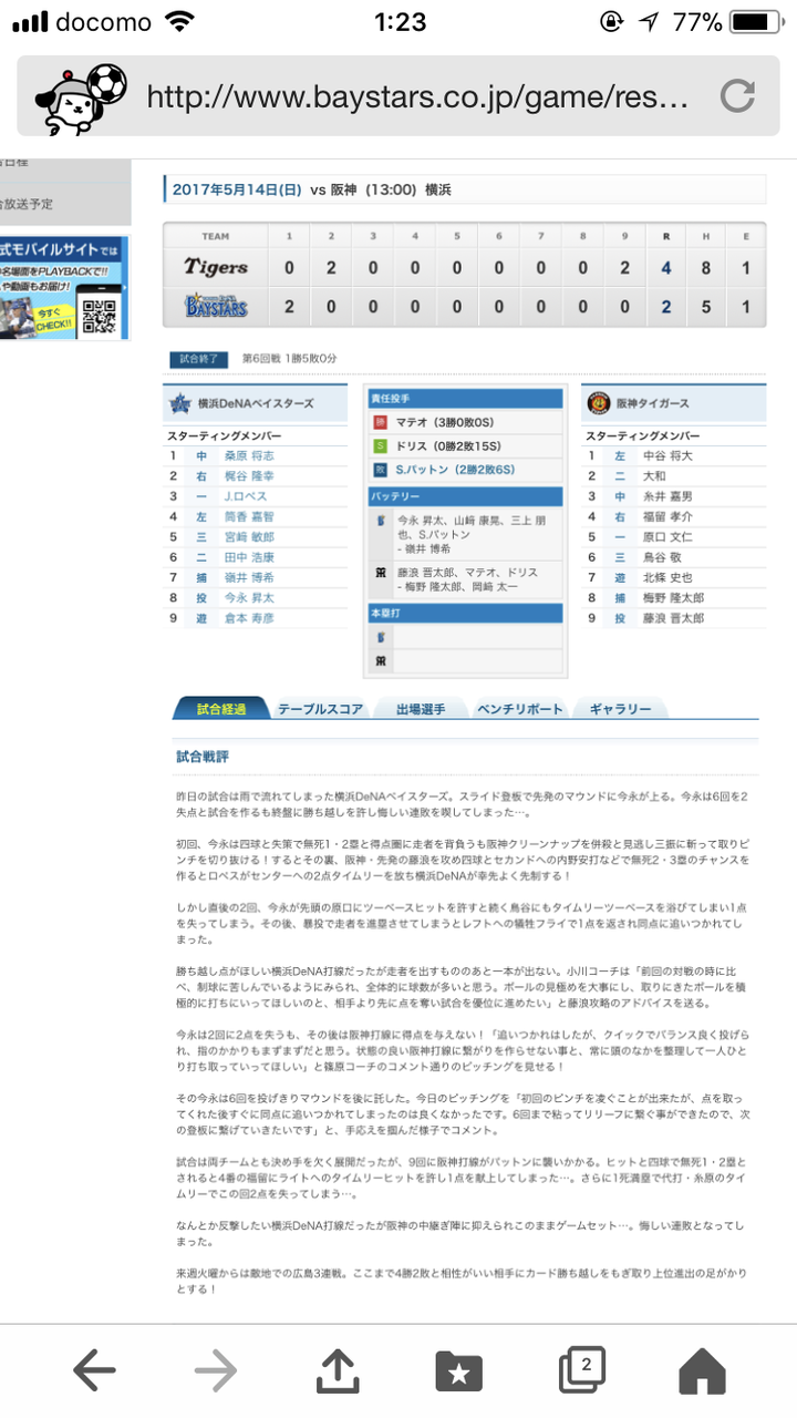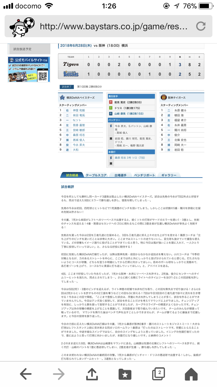 この日パットンが打たれ、山崎康晃が抑えに再度配置転換になった試合ですね。