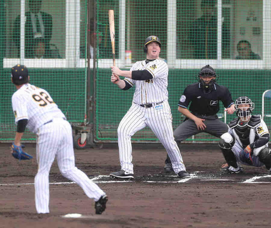初めての現役投手との対戦でいきなり2打数2安打1本塁打。いずれも左打者にとっては中堅から逆方向への打球だけに価値がある。キャンプ初日のフリー打撃でも左中間への3連発を含む54スイングで14発の大当たり。“バースの再来”との声まで上がる大砲に、虎党の期待は高まるばかりだ。