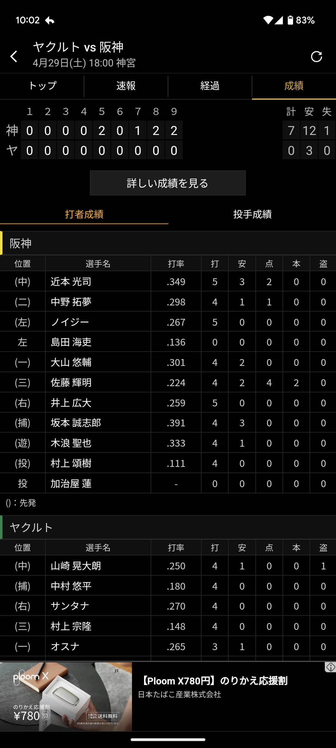 2040 山田 筒香 梅野 坂本 前健 立浪