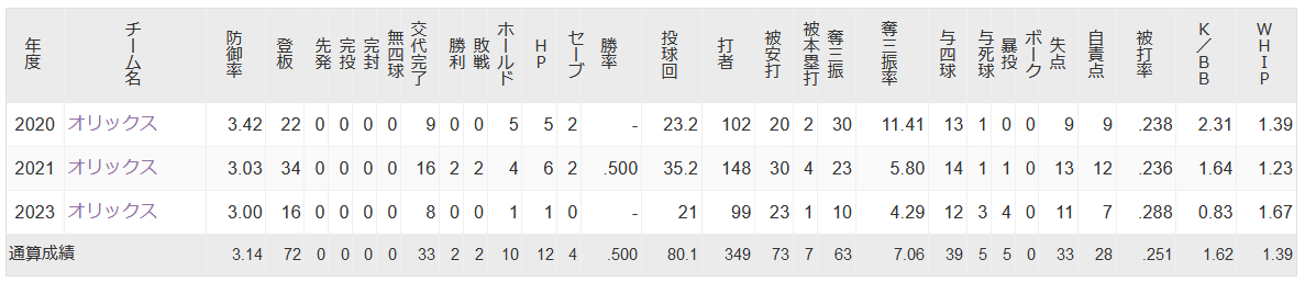 今季 19登板 2勝1敗3H 22回 2.45 WHIP1.14 17被安打 2被本塁打 8四球 0死球 2奪2三振 0暴投 8失点6自責点