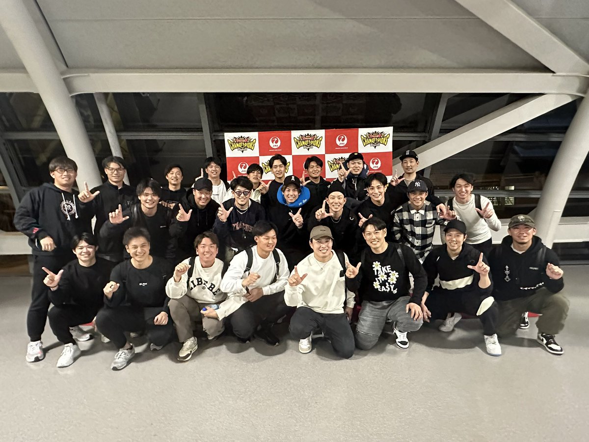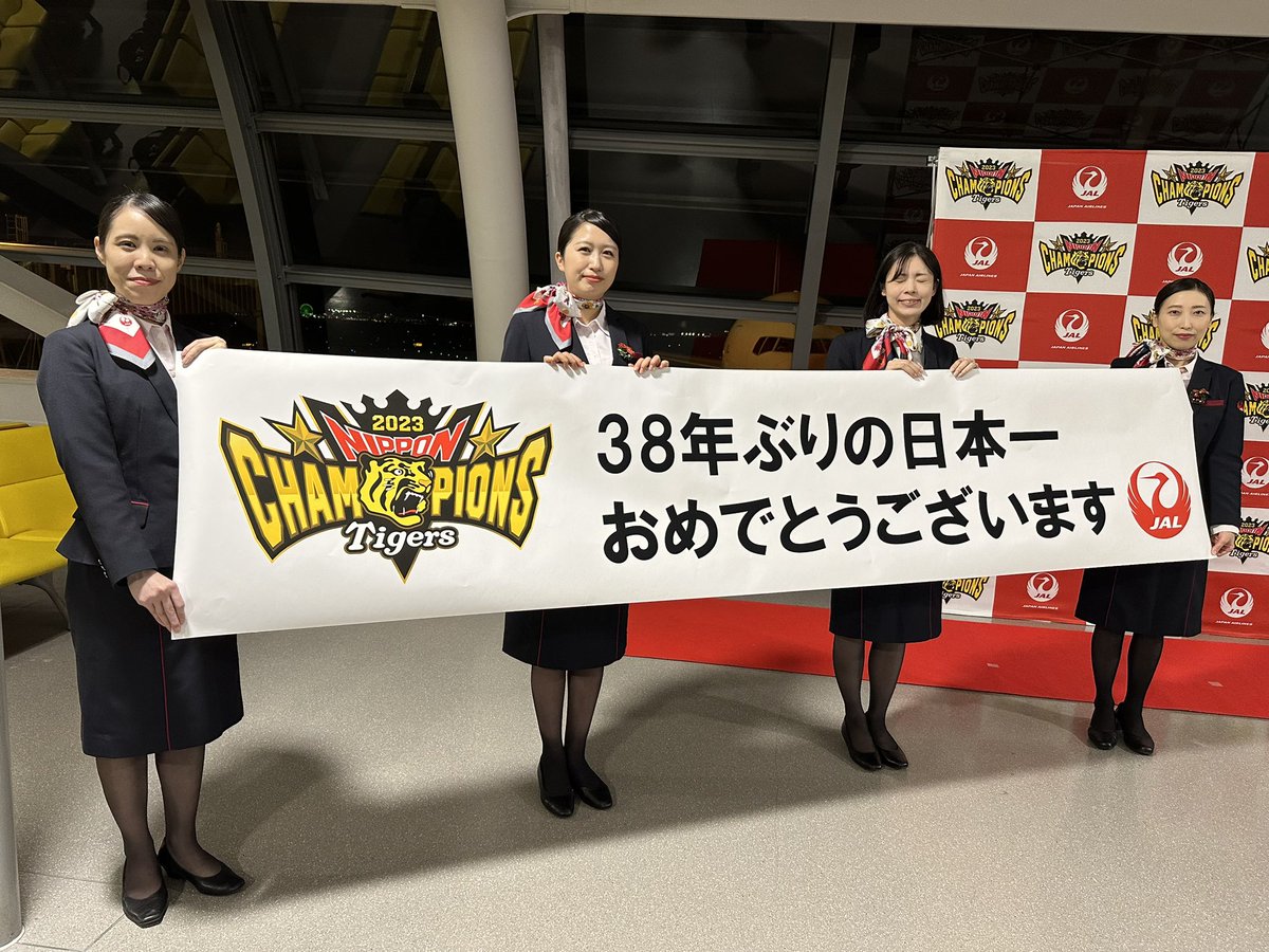 >岡田彰布監督、中野拓夢選手会長に近本光司外野手、大山悠輔内野手、佐藤輝明内野手ら首脳陣、選手37人が参加。打撃投手ら裏方さんや球団スタッフ、それぞれの家族も含めて総勢345人の大ツアー。220人が搭乗したチャーター機だけでなく、一部を通常便や東京発に振り分ける規模のV旅行となった。