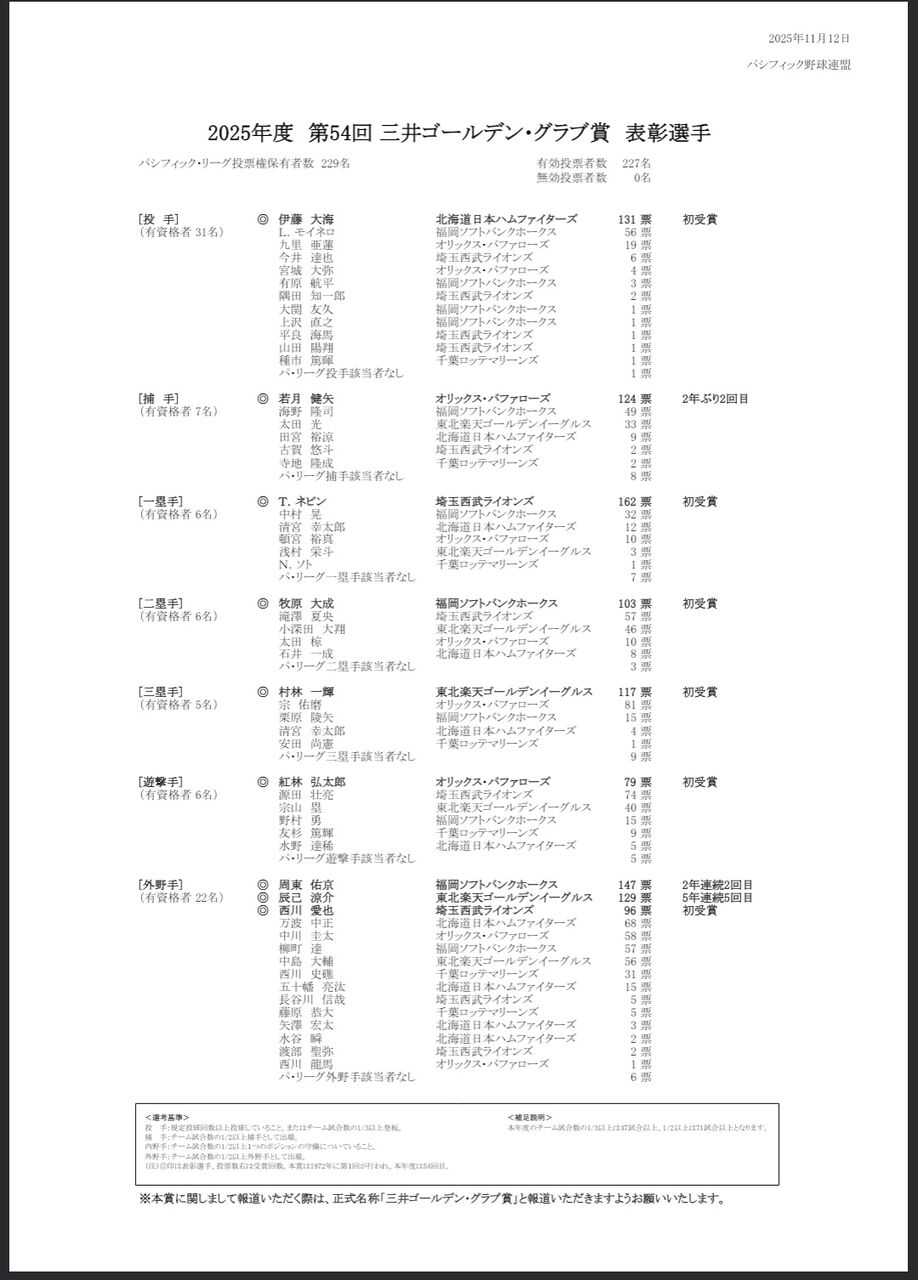[遊撃手] ◎ 泉口 友汰 巨人 165 票 初受賞