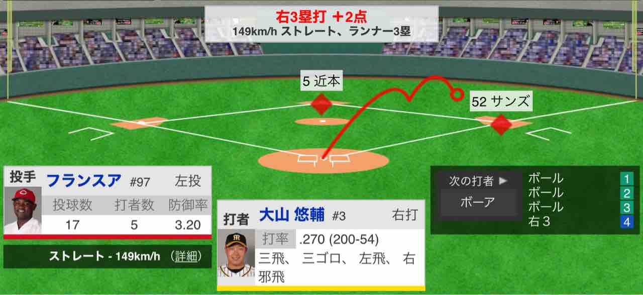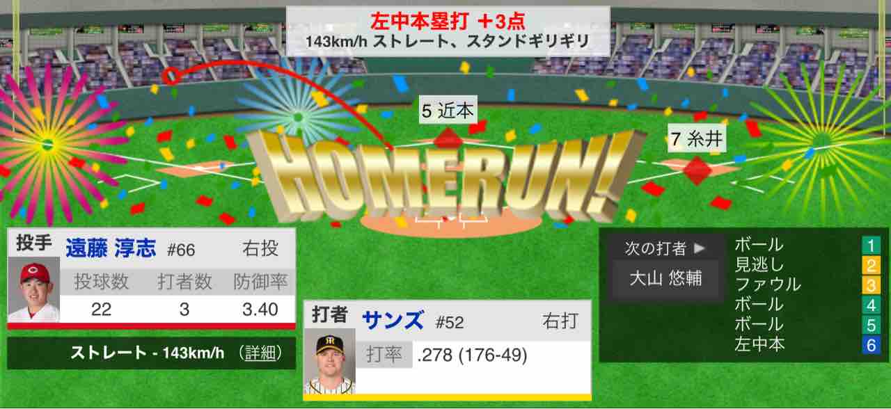 阪神が延長十回に大山の勝ち越し2点適時打が出て接戦をものにした。2か月連続の月間勝ち越しを決めた。ちょうど今季半分の60試合を終え、29勝28敗3分け。貯金1で前半戦を折り返した。