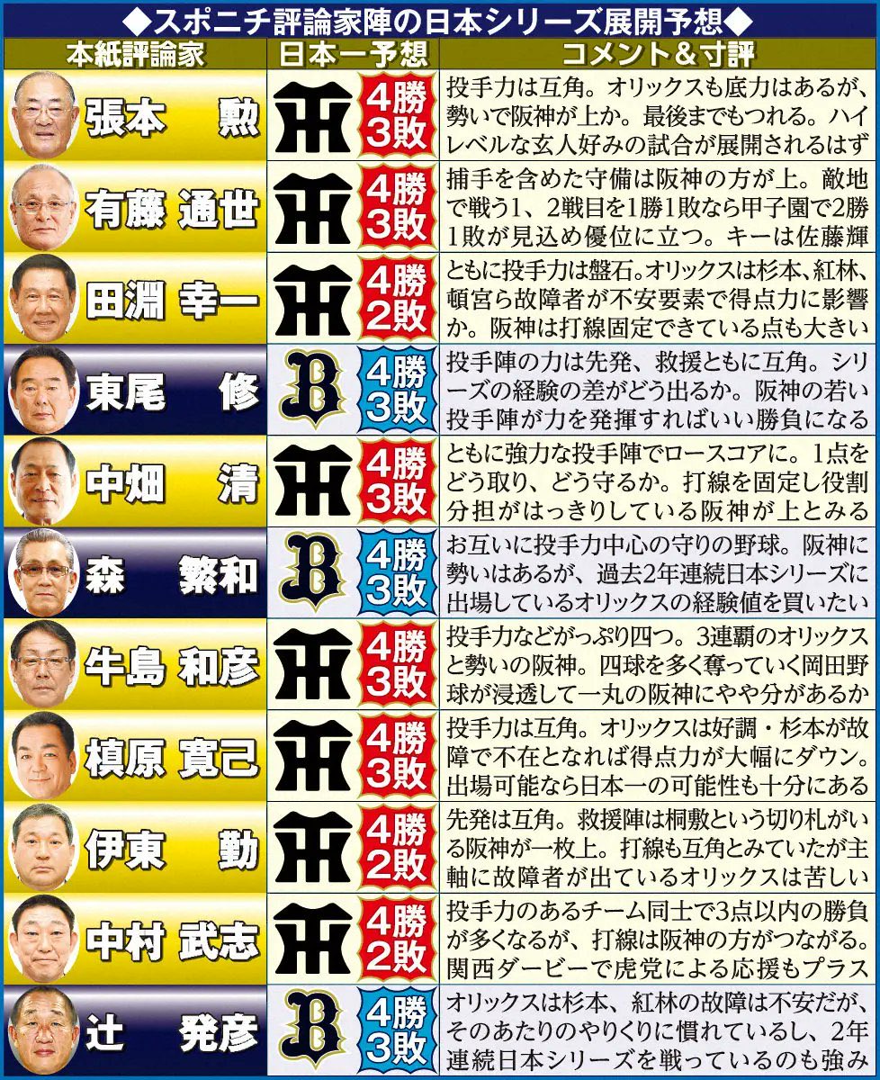 阪神オリックス日本シリーズ ほとんどの解説者が4勝3敗で第7戦まで行くと予想 2023年10月23日 カテゴリ:阪神 mixiチェック 1: それでも動く名無し 2023/10/23(月) 09:30:48.00 ID:h5DpUSI10 【阪神オリックス日本シリーズ ほとんどの解説者が4勝3敗で第7戦まで行くと予想】の続きを読む
