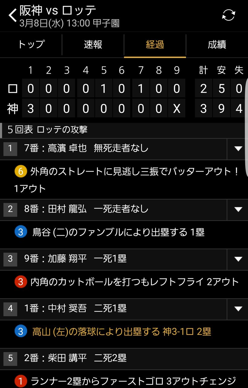 阪神秋山、打者5人をしっかりと打ち取り無事今期初失点